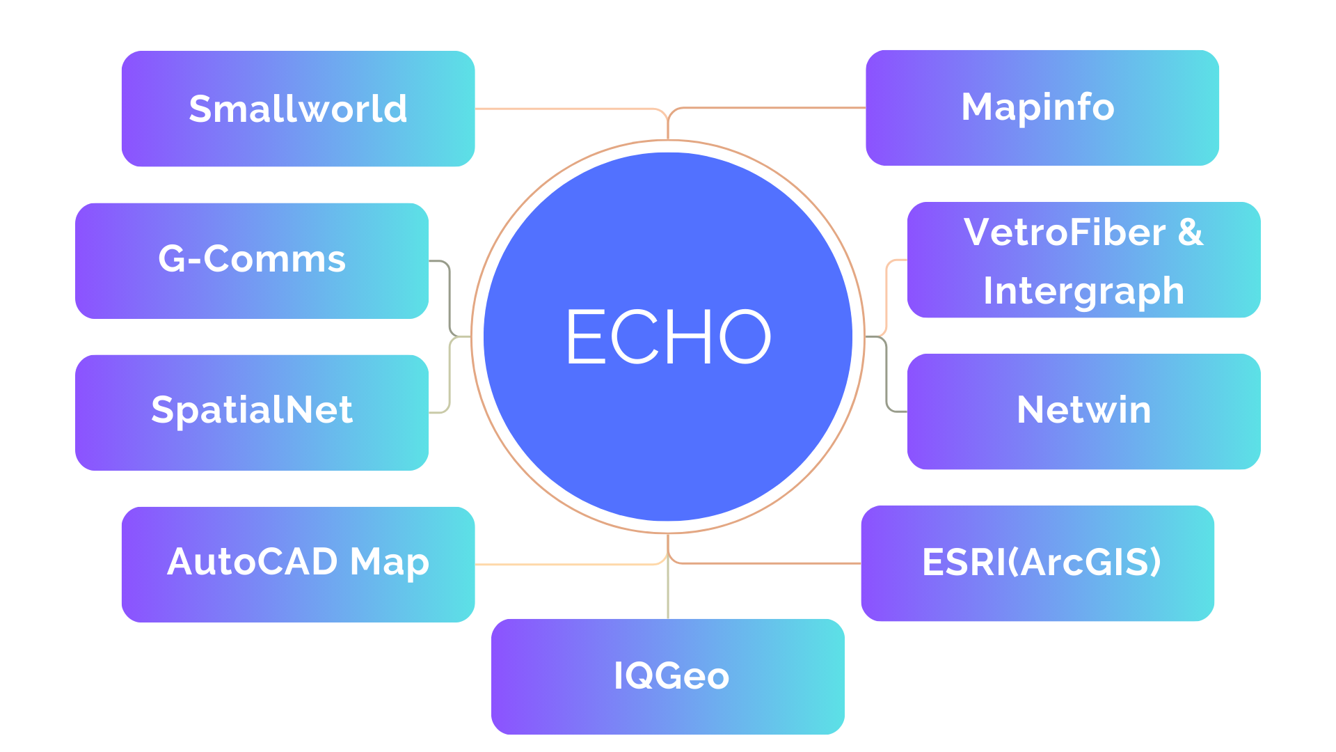 Smallworld, G-Comms, SpatialNet, ESRI/ArcGIS, Netwin, VetroFiber and Intergraph are recognized leading GIS software in the market today. Second league programs such as Mapinfo, and AutoCAD Map make up the rest of the playing field in the world of GIS, for telecommunication and utility fields. As ECHO has exposure in various GIS project worldwide over the past 20 years, we are confident to claim the fact that it is au fait with the majority suite of GIS programs, and complementary to this, possesses in-depth knowledge in order to offer a full range of turnkey broadband engineering services using the software
